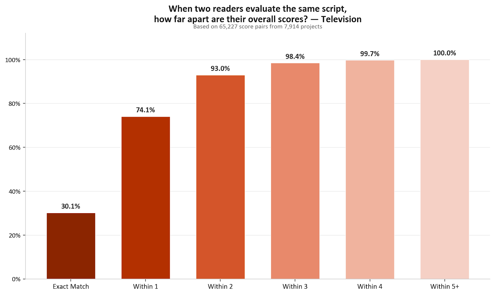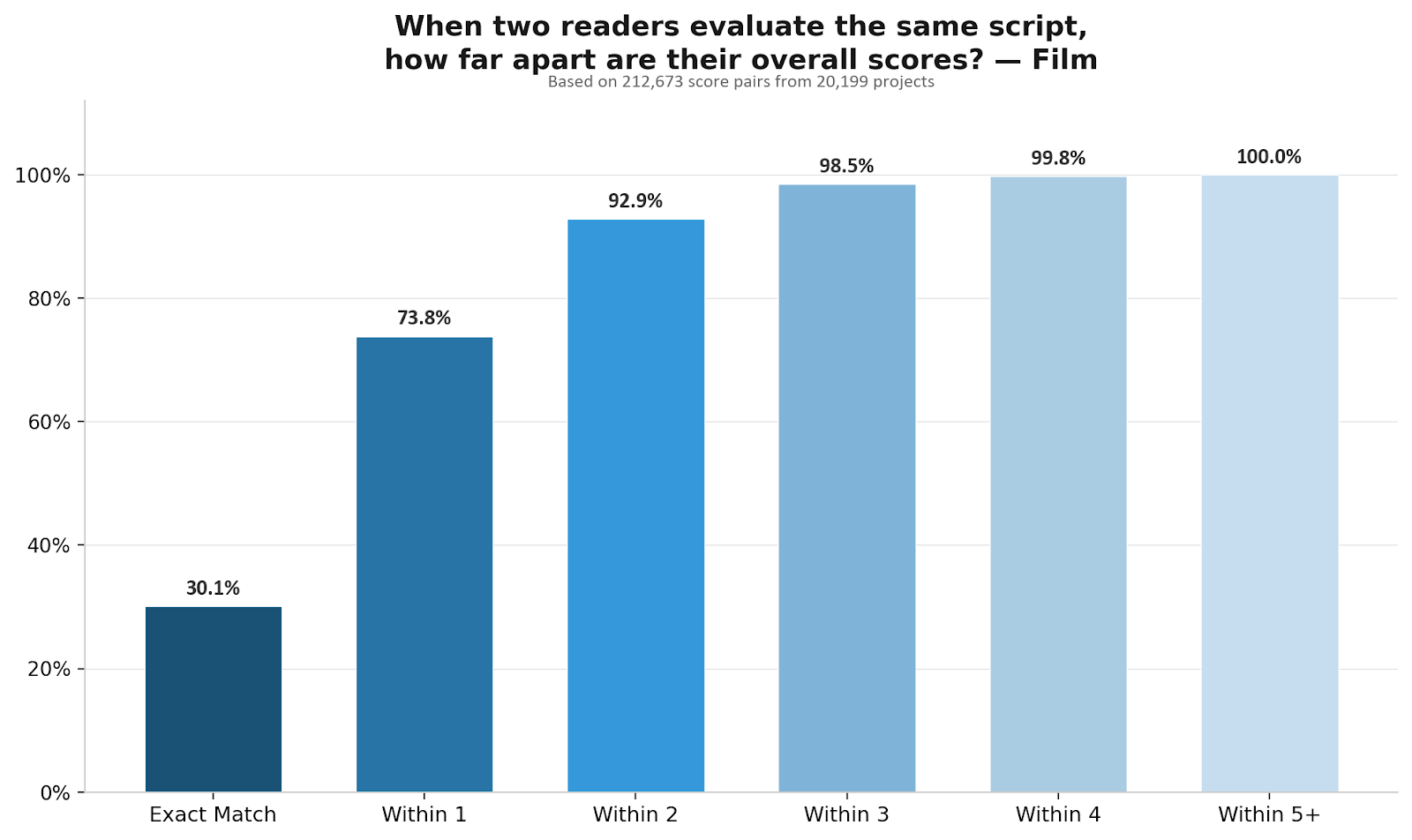 It’s a fair question. It’s also one that, as far as I know, no one in this industry has ever answered publicly with data. Not talent agencies. Not film festivals. Not studios. No one who evaluates screenplays or television scripts at scale for a living has ever shown you the numbers on how consistent their readers actually are.