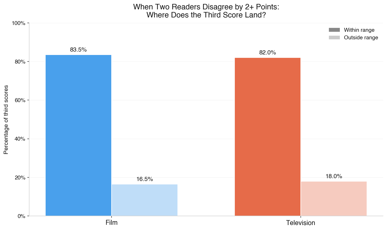 4 For the third-reader analysis, we used all projects with exactly three evaluations (4,121 film, 1,571 television). For each project, we considered all three possible designations of which evaluation serves as the “third read.” We then filtered to cases where the other two evaluations diverged by two or more points on overall quality and measured how often the third fell within the range set by those two scores, inclusive of endpoints.