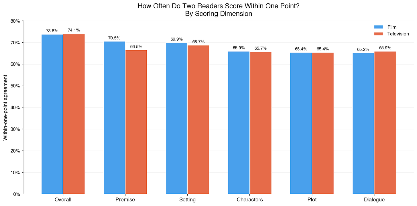 When two Black List readers independently evaluate the same screenplay, they score it within one point of each other on overall quality 73.8% of the time. For television pilots, it’s 74.1%.