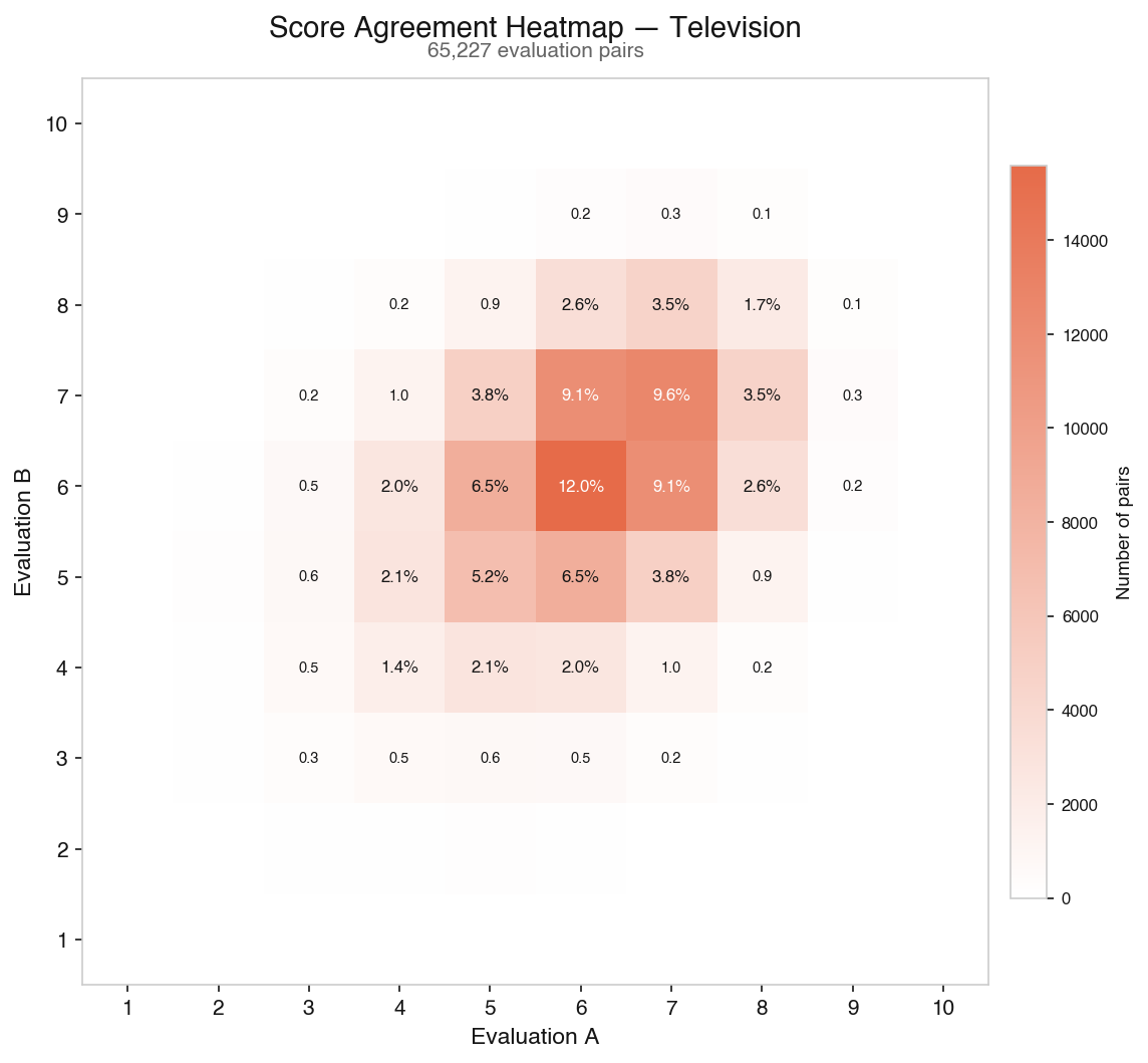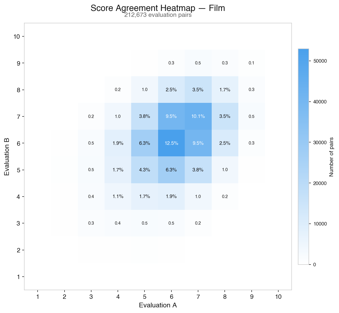 ¹ Though there have been 128,020 evaluations across more than 71,000 projects, not all projects have been evaluated more than once. An evaluation pair means two readers who independently evaluated the same project. A project with two evaluations produces one pair. A project with three produces three. A project with ten produces forty-five. Because many projects on the platform have been evaluated multiple times, 128,020 individual evaluations generate 277,900 unique reader-to-reader comparisons — 212,673 for film and 65,227 for television.