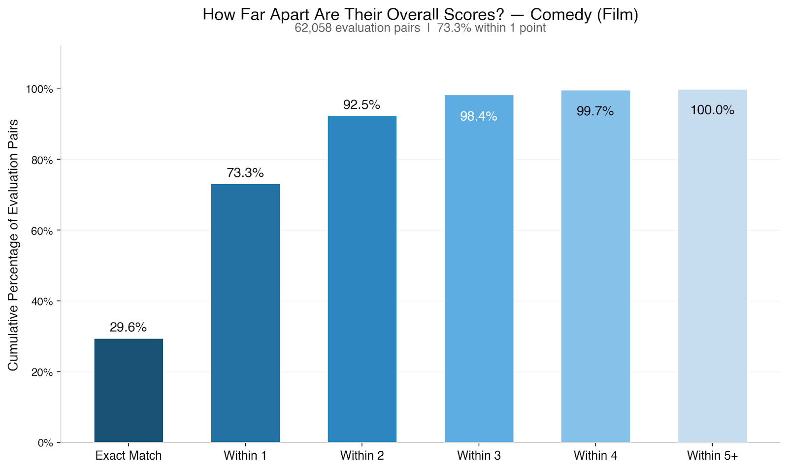 30% of the time, they give the exact same score. Another 44% differ by exactly one point. A 6 and a 7. A 5 and a 6.