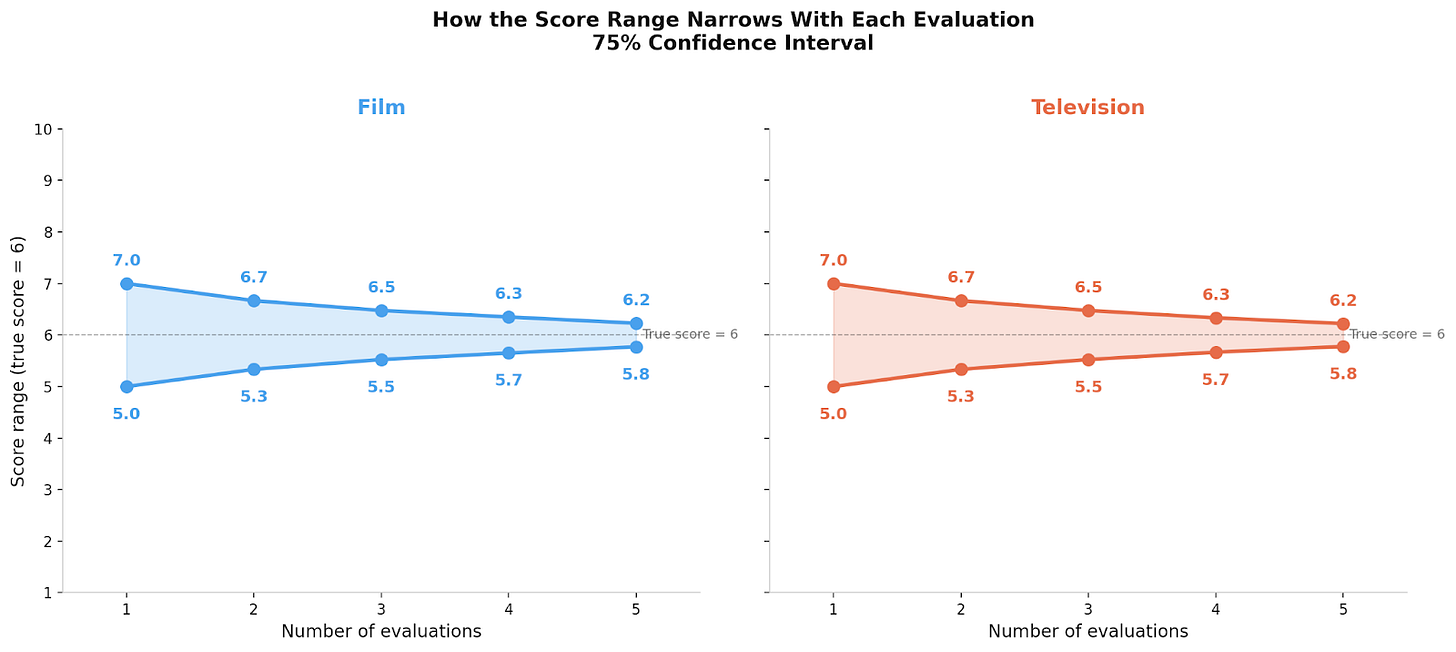 After a single evaluation, the “true” score — the average you’d get if dozens of qualified readers evaluated the same script — falls within one point of your score about 75% of the time.3 After two evaluations averaged together, that range tightens to about 0.6 points. After three, about 0.4. After four, about 0.25.